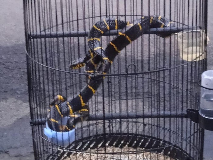 Selepas Salat Subuh, Sukarjo (60) sudah dibuat kaget. Sangkar yang sedianya dihuni burung kenari kesayangannya, mendadak diisi oleh seekor ular cincin emas.