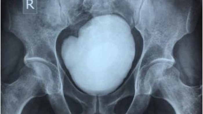 Dikutip dari LiveScience, saat dokter melakukan pemeriksaan fisik pada perut pasien, ditemukan adanya massa besar yang halus dan keras di atas tulang kemaluan (pubis), yaitu bagian depan panggul tempat kedua tulang kemaluan bertemu dan dihubungkan oleh tulang rawan. Massa padat tersebut tidak melekat pada area panggul maupun dinding perut.