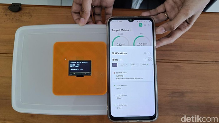 Hasil pendeteksian ditampilkan melalui indikator. Jika makanan tidak aman, akan muncul tulisan ‘terdeteksi’. Di bagian atas terdapat simbol MQ135 sebagai indikator untuk bahan pangan hewani, dan MQ3 untuk pangan nabati.