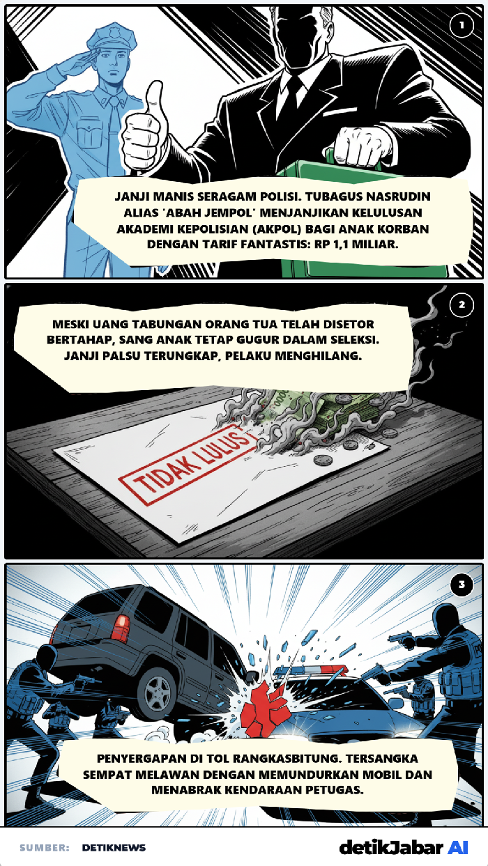 Mimpi besar seorang warga untuk melihat sang anak mengenakan seragam cokelat taruna Akademi Kepolisian (Akpol) berakhir pilu. Harapan yang dipupuk setinggi langit itu hancur lebur setelah ia terjebak muslihat pria bernama Tubagus Nasrudin alias alias Abah Jempol (48). Alih-alih mendapatkan tiket masuk pendidikan kepolisian, korban justru merugi hingga Rp 1 miliar.