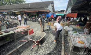 Lelah Tunggu Pemda, Pedagang Perbaiki Jalan Rusak di Pasar Pangandaran