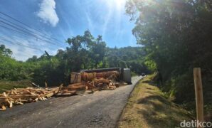 Truk Gagal Nanjak hingga Terguling di Tanjakan Pasir Bilik Sukabumi