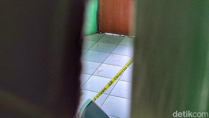 Garis polisi tampak melintang di area tersebut. Dua pintu gudang kini tertutup rapat, namun bercak darah sisa kejadian tragis itu masih terlihat jelas di lantai.