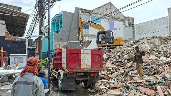 Dari pantauan infoProperti di lokasi, Jumat (14/11/2025) siang, terlihat ada dua ekskavator yang tengah mengeruk puing-puing bangunan rumah Sahroni. Ada juga tiga dump truck yang hilir mudik mengangkut puing-puing bangunan.