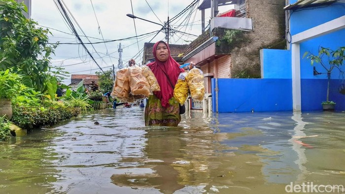 Tidak ada pilihan bagi Yayah untuk terus mencari rezeki meski dalam kondisi banjir. Hal tersebut dilakukan demi menyambung hidup dengan berjualan rezeki.