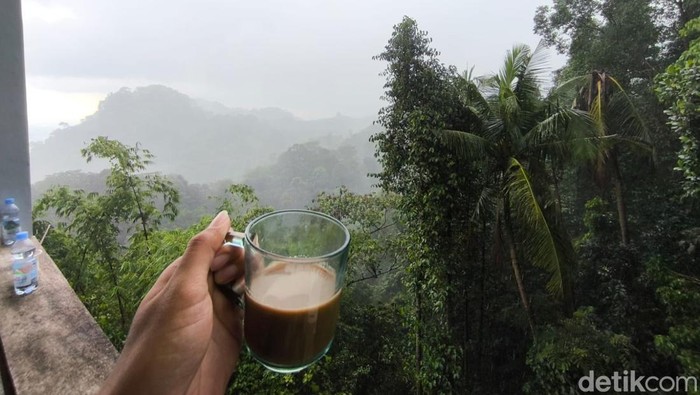 Saat hujan turun, panorama semakin dramatis. Kabut tebal perlahan menyelimuti perbukitan, menciptakan suasana dingin yang khas pegunungan. Kondisi ini kerap dinikmati pengunjung sambil menyeruput kopi hangat atau menyantap mi instan panas.